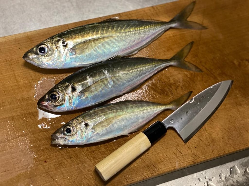 …20分後、唐突に少し離れた人にヒット。アジだ。続けてポツポツと周りも釣れ始めた