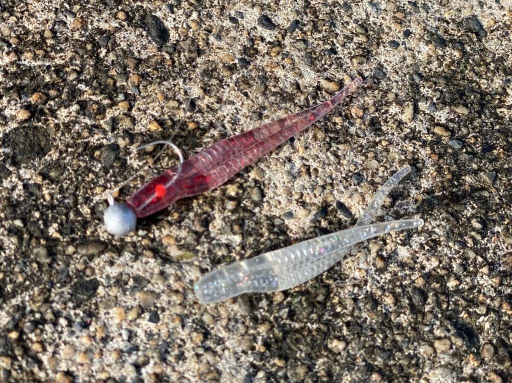 ちなみにワームも色々試しました。濁りが入っていたのでチャート系かなぁ…と当初思っていたんですが反応が良かったのはクリア系